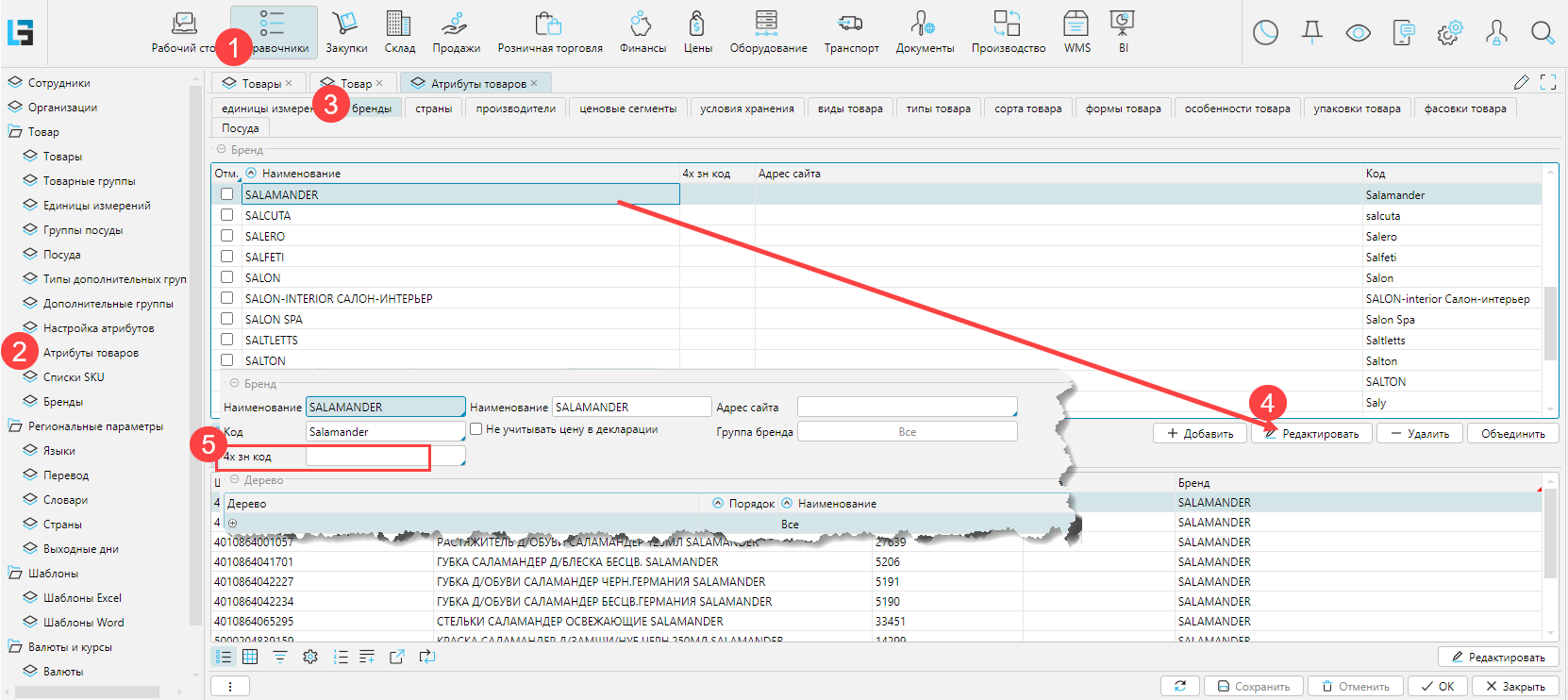 3. В настройках атрибута Бренд: на форме Справочники - Атрибуты товаров на вкладке Бренды открыть на редактирование бренд и установить 4-значный код, который будет наследуется товарам бренда.