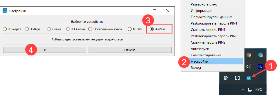 2. После установки и запуска ПО значок работающего приложения будет отображаться в области уведомлений панели задач. Необходимо нажать правой клавишей мыши на значок, в контекстном меню выбрать команду Настройки, в открывшемся окне выбрать AvPass и нажать ОК.