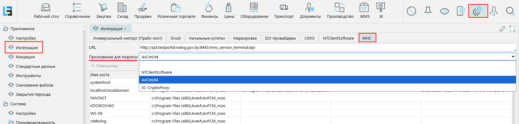 1. На форме Администрирование - Интеграция вкладка МНС указать путь подключения к СПТ и выбрать приложение для подписи.