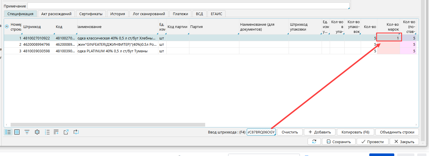 - Использовать сканер штрихкодов и сканировать алкогольные марки непосредственно в документ. Для этого поле Кол-во марок должно быть активным, код маркировки сканируется в поле штрихкод.