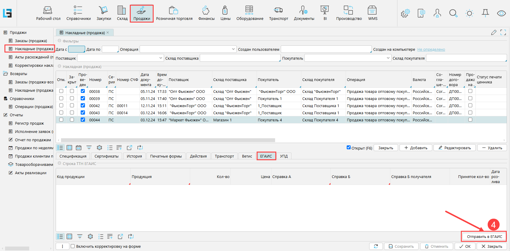 - На форме с перечнем расходных документов перейдите на вкладку ЕГАИС и нажмите Отправить в ЕГАИС. Система сформирует все необходимые документы и отправит в ЕГАИС