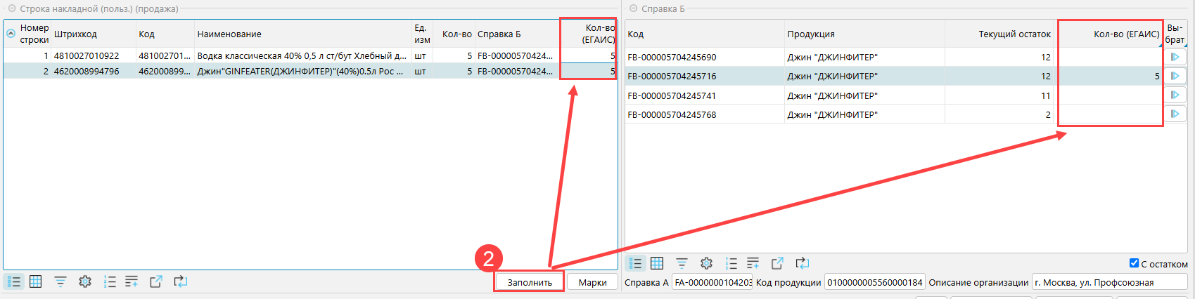 - После того, как спецификация заполнена, нужно перейти на вкладку ЕГАИС. В левом блоке отображаются строки накладных, а в правом по каждой строке накладной отображаются доступные партии ЕГАИС. Нужно нажать кнопку Заполнить и программа распишет товары по партиям ЕГАИС в соответствии с марками.