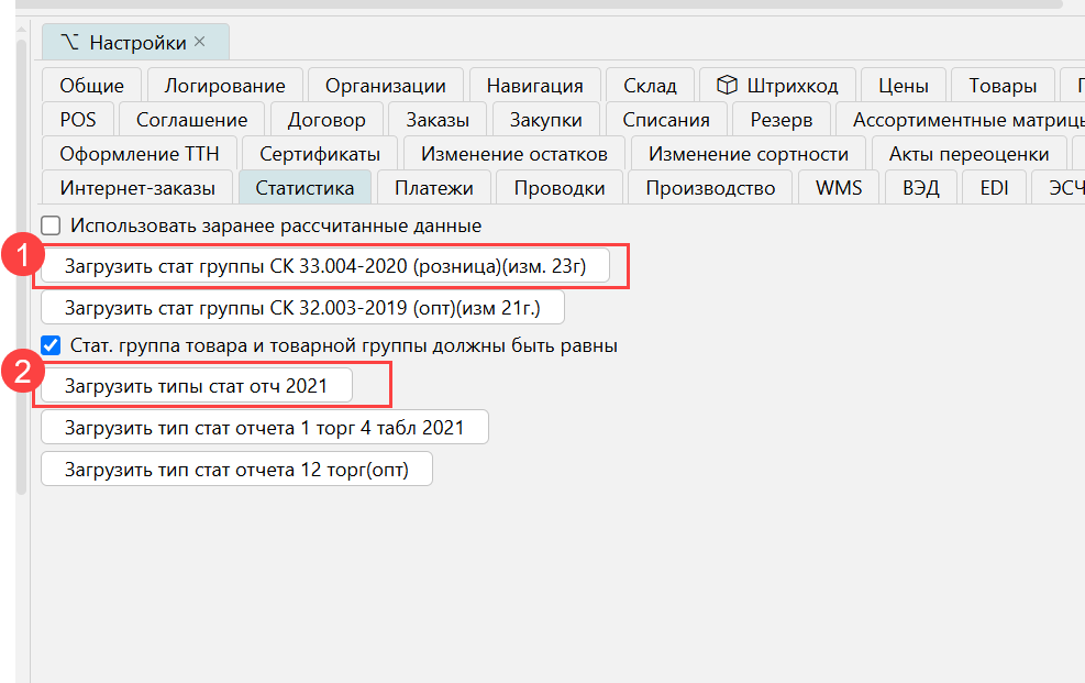 В lsFusion ERP реализован механизм актуализации статистических справочников и типов статистических отчетов. Для этого нужно зайти в Администрирование - Настройки - вкладка Статистика и нажать кнопку Загрузить стат группы СК 33.004-2020 (розница)(изм. 23г), затем нажать Загрузить типы стат отч 2021