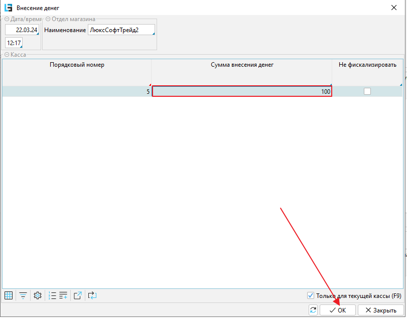 В открывшемся окне вносим сумму наличных и нажимаем ОК