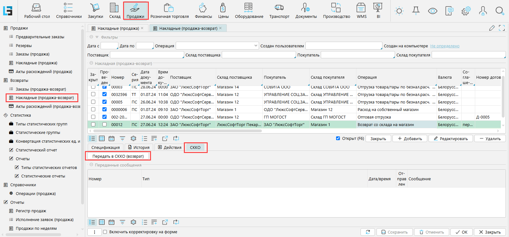 Аналогичным образом на форме Продажи - Возвраты - Накладные (продажа-возврат) в СККО отправляются данные о возврате реализованного маркированного товара. Отправленные данные о возврате аннулировать невозможно.