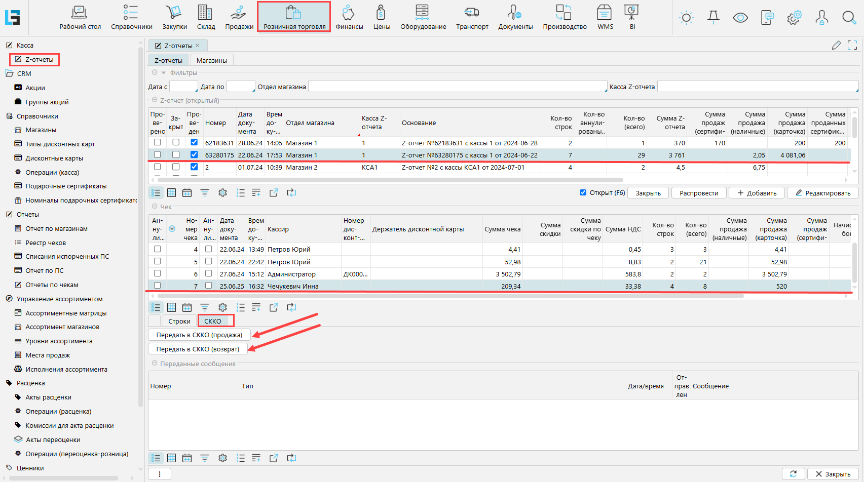 Данные в СККО можно отправлять по чекам Z-отчетов. На форме Розничная торговля - Касса - Z-отчеты выделите курсором нужный Z-отчет и чек в нем. В зависимости от позиций в чеке на вкладке СККО будут доступны кнопки Передать в СККО (продажа) и/или Передать в СККО (возврат). В таблице ниже будут отображаться переданные в СККО сообщения. Как и для накладных, можно аннулировать отправленные данные по продаже.