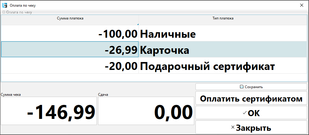 - Произвести выплату по возврату аналогично оплате по чеку. Если для возврата использовать смешанный платеж, то суммы каждого вида платежа нужно прописывать со знаком "-".