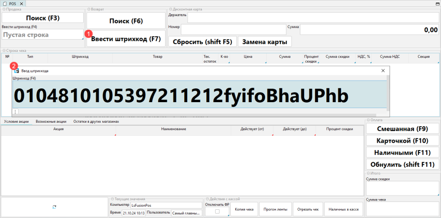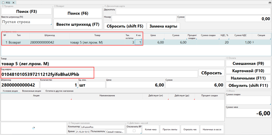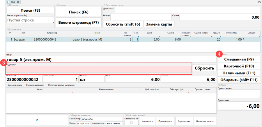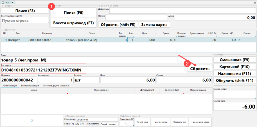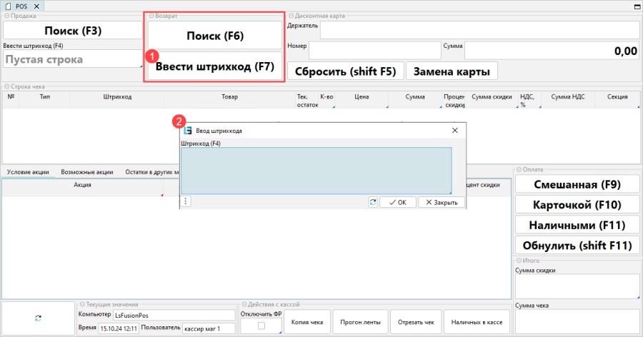 - Нажать Ввести штрихкод в блоке Возврат или клавишу F7