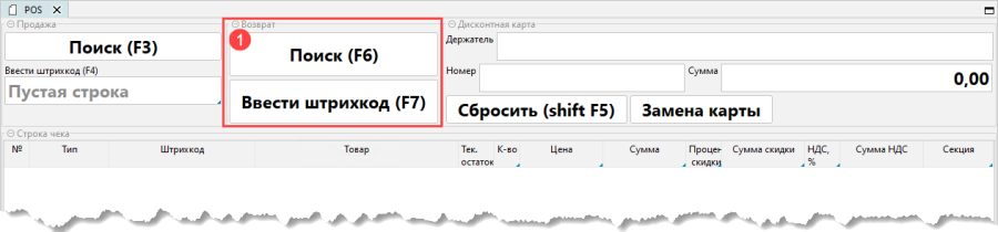 - для добавления позиции возврата нужно провести поиск по штрихкоду или чеку