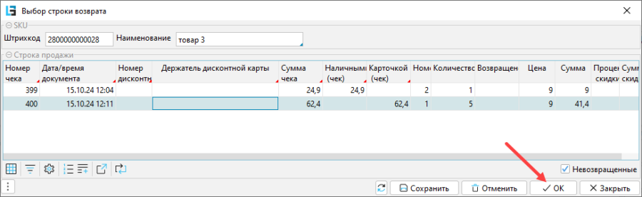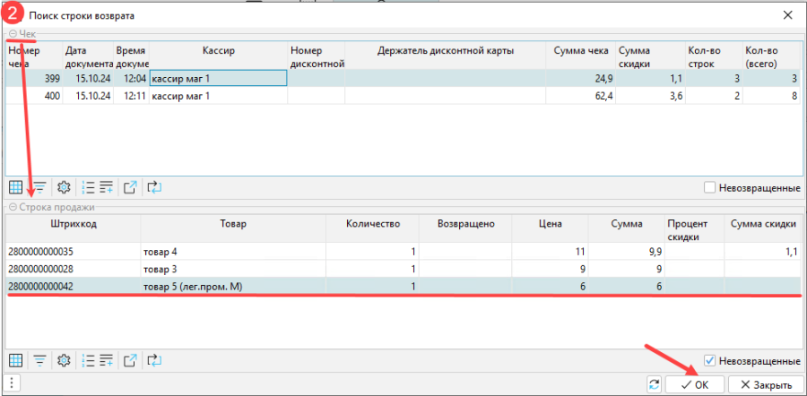 - Откроется окно поиска строки возврата. В верхней части отображены все чеки, в нижней - строки выделенного чека. Нужно найти чек и выделить строку, по которой будет возврат, нажать ОК