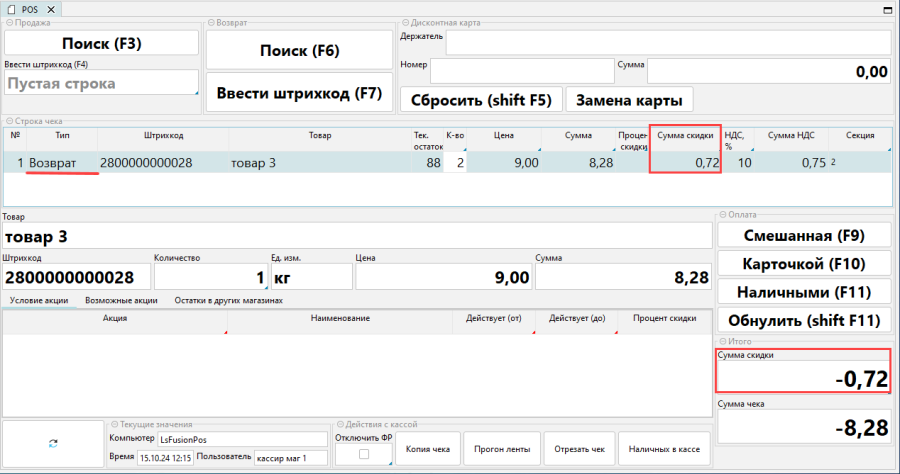 - Товар будет добавлен как позиция чека с типом возврат. Нужно указать количество товара, если покупатель возвращает несколько единиц товара. Если товар был реализован со скидкой, то предоставленная при продаже скидка будет учтена в сумме возврата