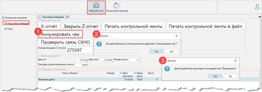 Аннулировать можно только последний пробитый чек. Для этого нужно перейти на форму Рабочий стол - Кассовые операции и нажать кнопку Аннулировать чек, затем согласиться продолжить действие.