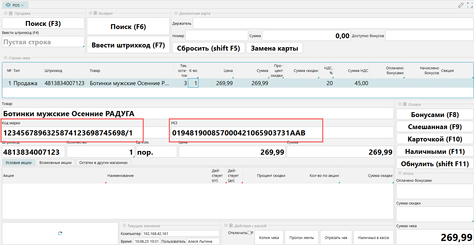 Для добавления в чек маркированного товара (СИ) нужно сканировать не штрихкод товара, а марку. В чек будет добавлена товарная позиция, отобразится код маркировки, количество товара будет «1». Чтобы добавить еще товары, нужно отсканировать марку каждого товара (рис. 2).
