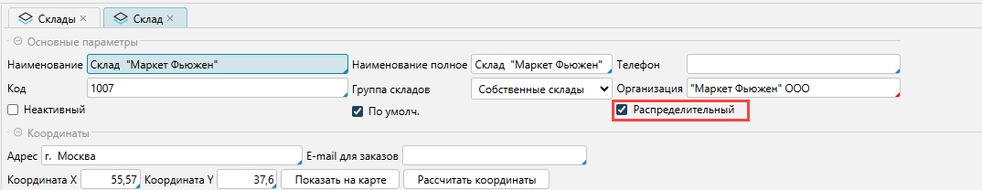 Отм. - В колонке нужно отметить флажком те магазины, по заказам из которых будет распределяться товар со склада. По умолчанию отмечены все отделы магазинов.