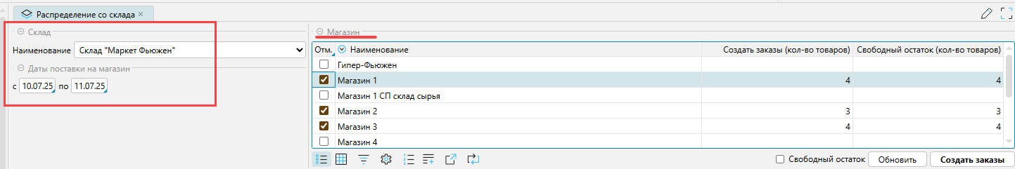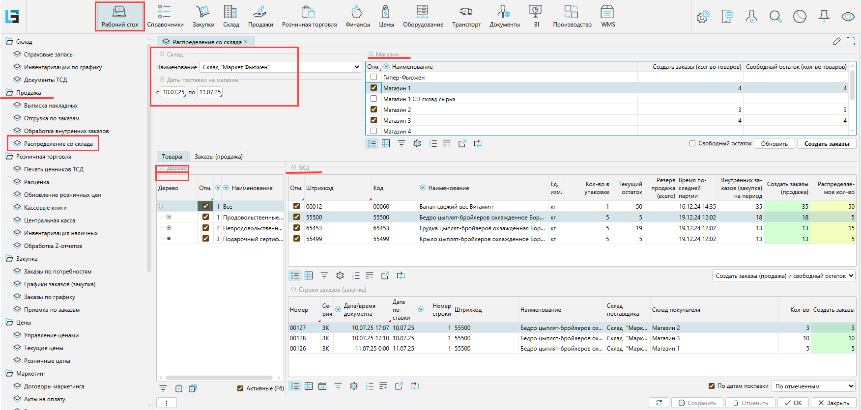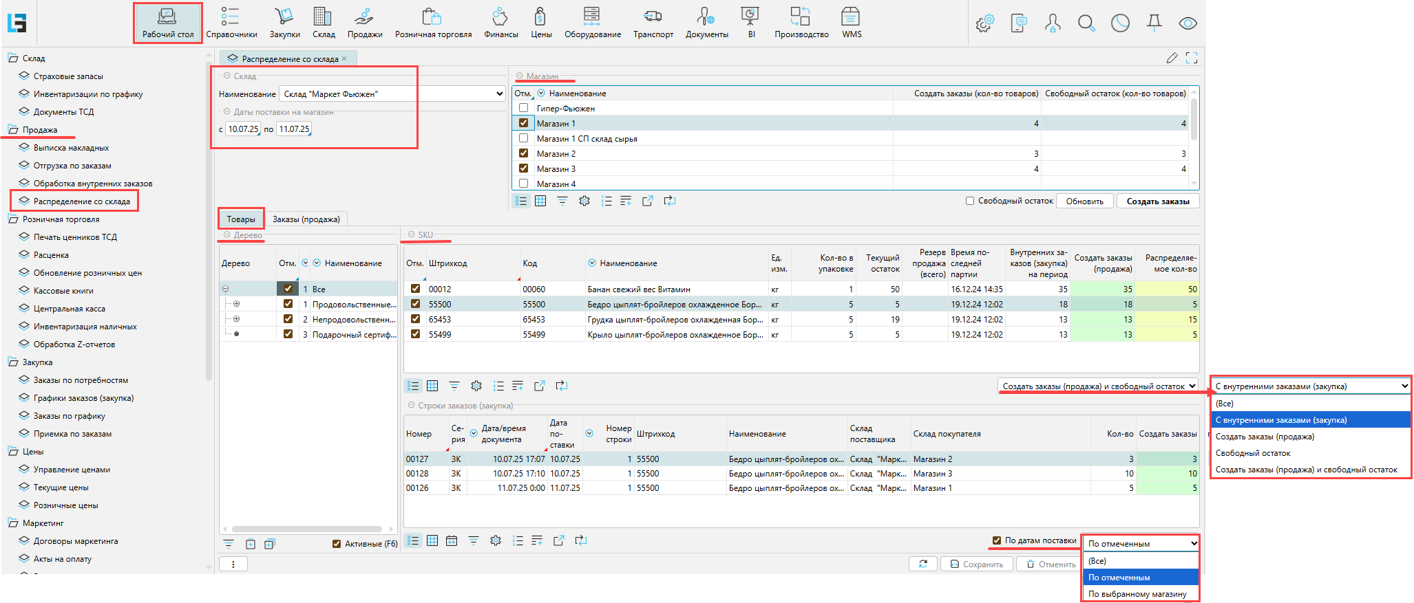 Механизм распределения остатков товаров на складе по заказам магазинов позволяет массово создавать заказы на продажу со склада на основании заказов на закупку магазинов, с несколькими возможными алгоритмами при распределении дефицитных товаров.