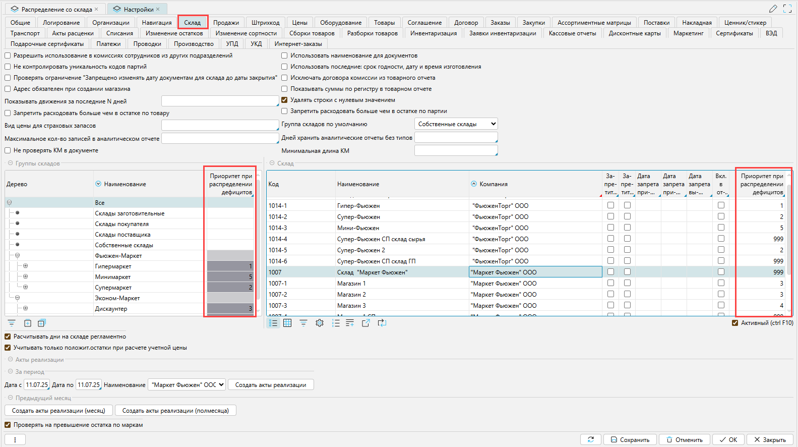 Приоритет отделов магазинов настраивается на вкладке Склад. В колонке Приоритет при распределении дефицитов можно установить приоритет для группы магазинов или для отдельных магазинов (отделов). Чем меньше число, тем выше приоритет.