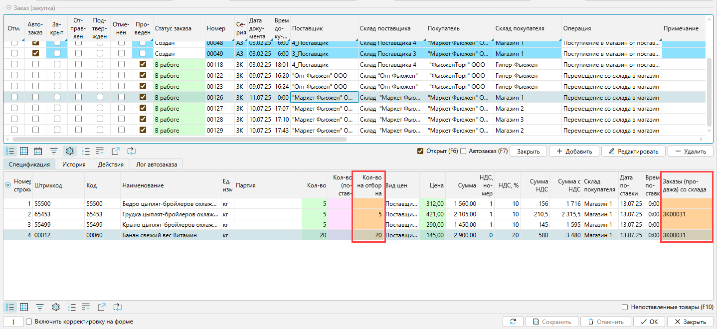 Система отображает, сколько заказов на закупку из магазинов обеспечено созданными заказами на продажу, распределяя проведенные строки заказов (продажа) по строкам заказов (закупка) по FIFO. Для заказов (закупка) эти значения отображаются в тёмно-желтых колонках Кол-во на отбор на складе на форме Закупки - Заказы (закупка) (рис. 6). Для заказов (продажа) - темно-желтые колонки на закладке Заказы(продажа) (рис. 5) формы Распределение со склада .