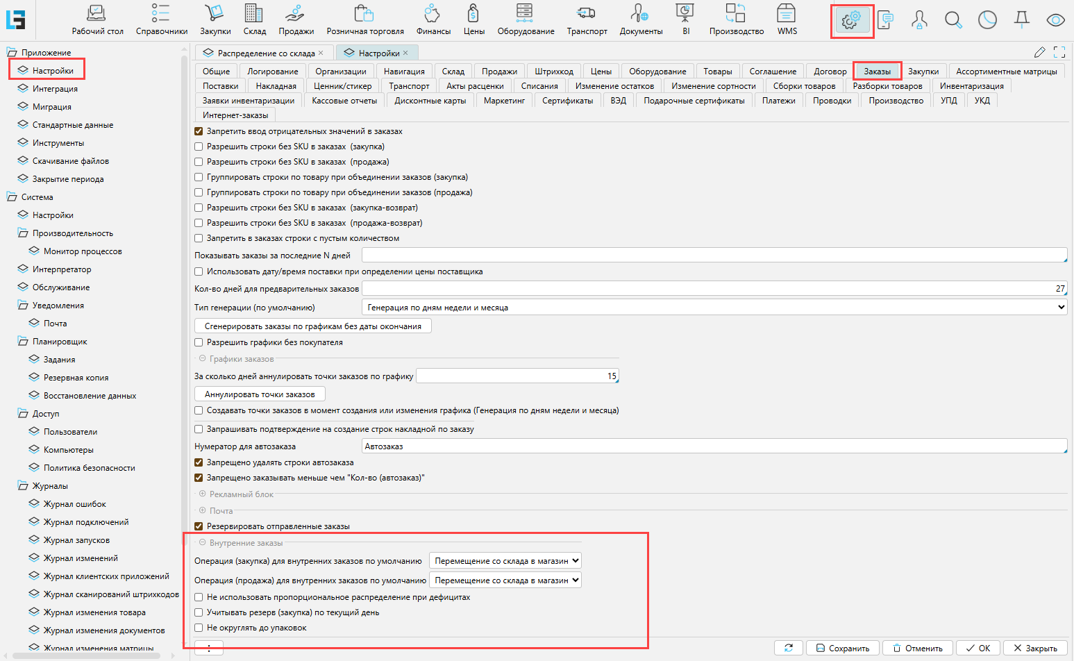 Большинство параметров распределения остатков склада по заказам настраиваются на форме Администрирование - Приложение - Настройки на вкладке Заказы в блоке Внутренние заказы
