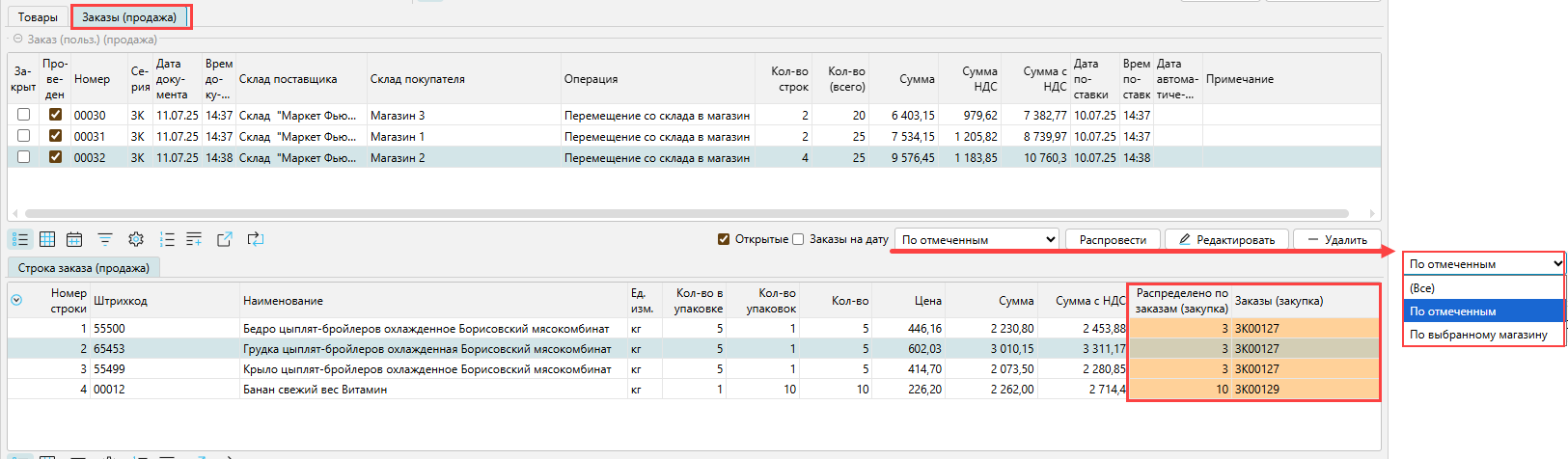 • Создать заказы (продажа) - товары, которые есть в заказах на закупку из магазинов и по которым еще не созданы заказы на продажу.