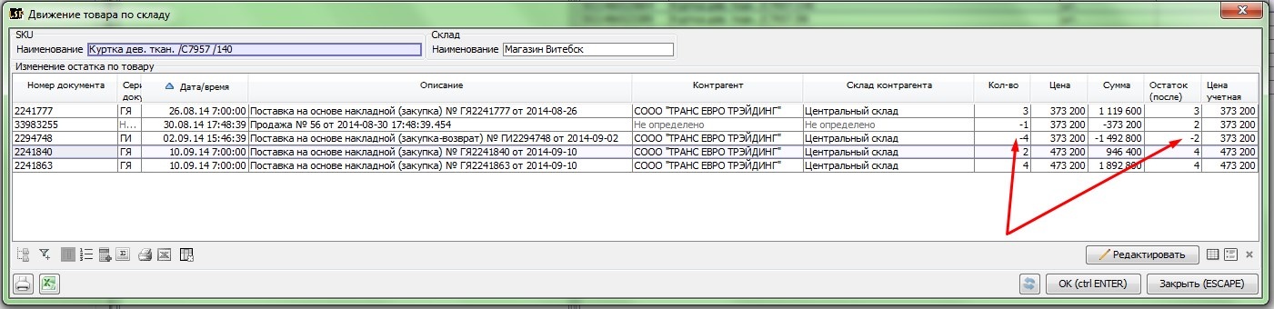 (опять же по нажатию правой кнопки мыши и выборе "Движение по складу") и внести исправление по количеству перемещаемого товара.