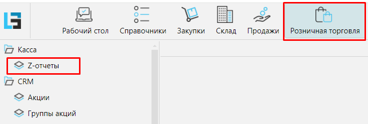 Заходим на форму "Z-отчеты" (модуль Розничная торговля раздел Касса).