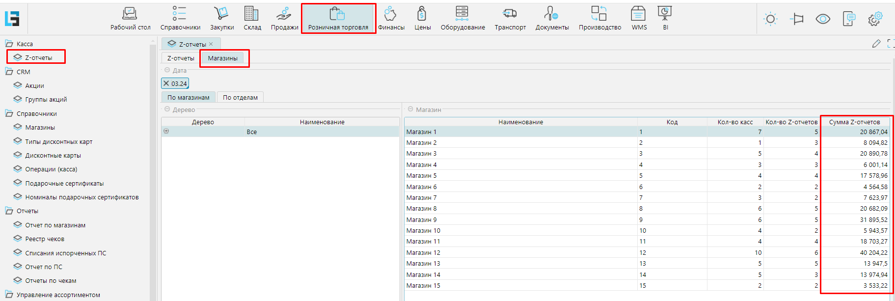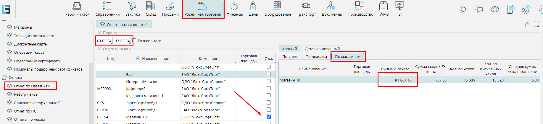Ставим нужную дату и сверяем общие суммы по каждому магазину.