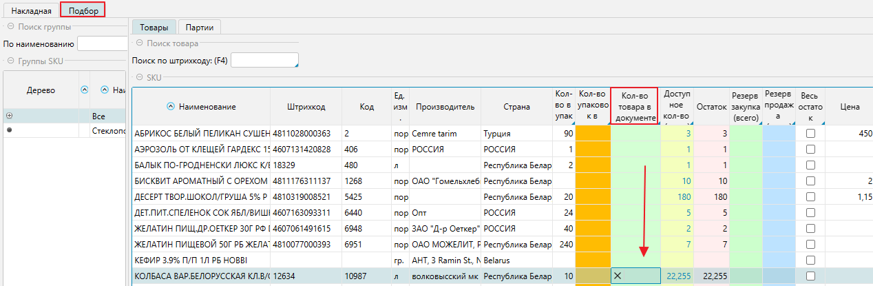 Переходим в закладку Подбор, проставляем количество товара в зеленом поле "Кол-во товара в документе" (более подробное описание работы в закладке Подбор см. в п.4. здесь).