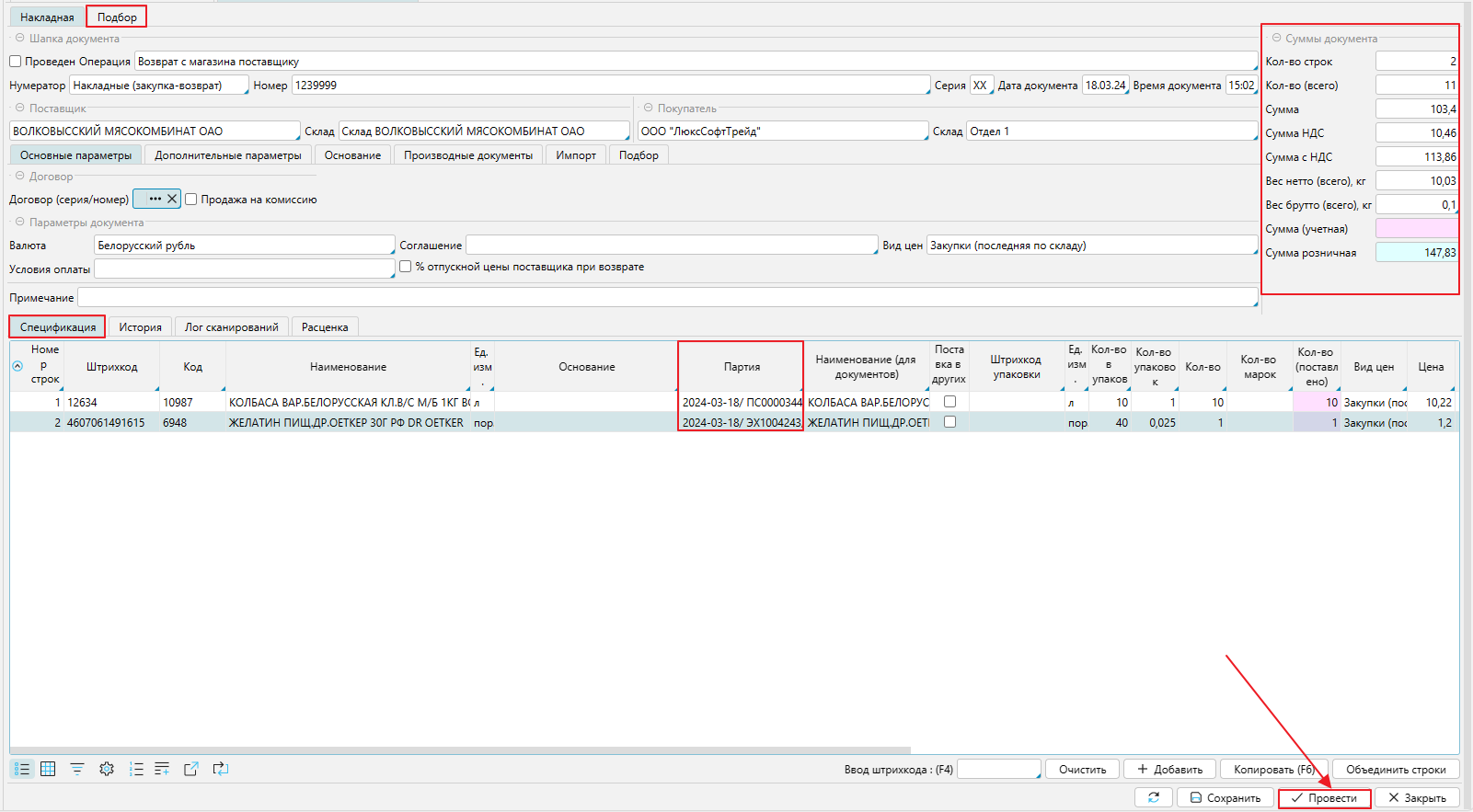 Если нам необходимо вернуть товар из определенной партии мы можем выбрать партию, кликнув по пустому полю в колонке "Партия".