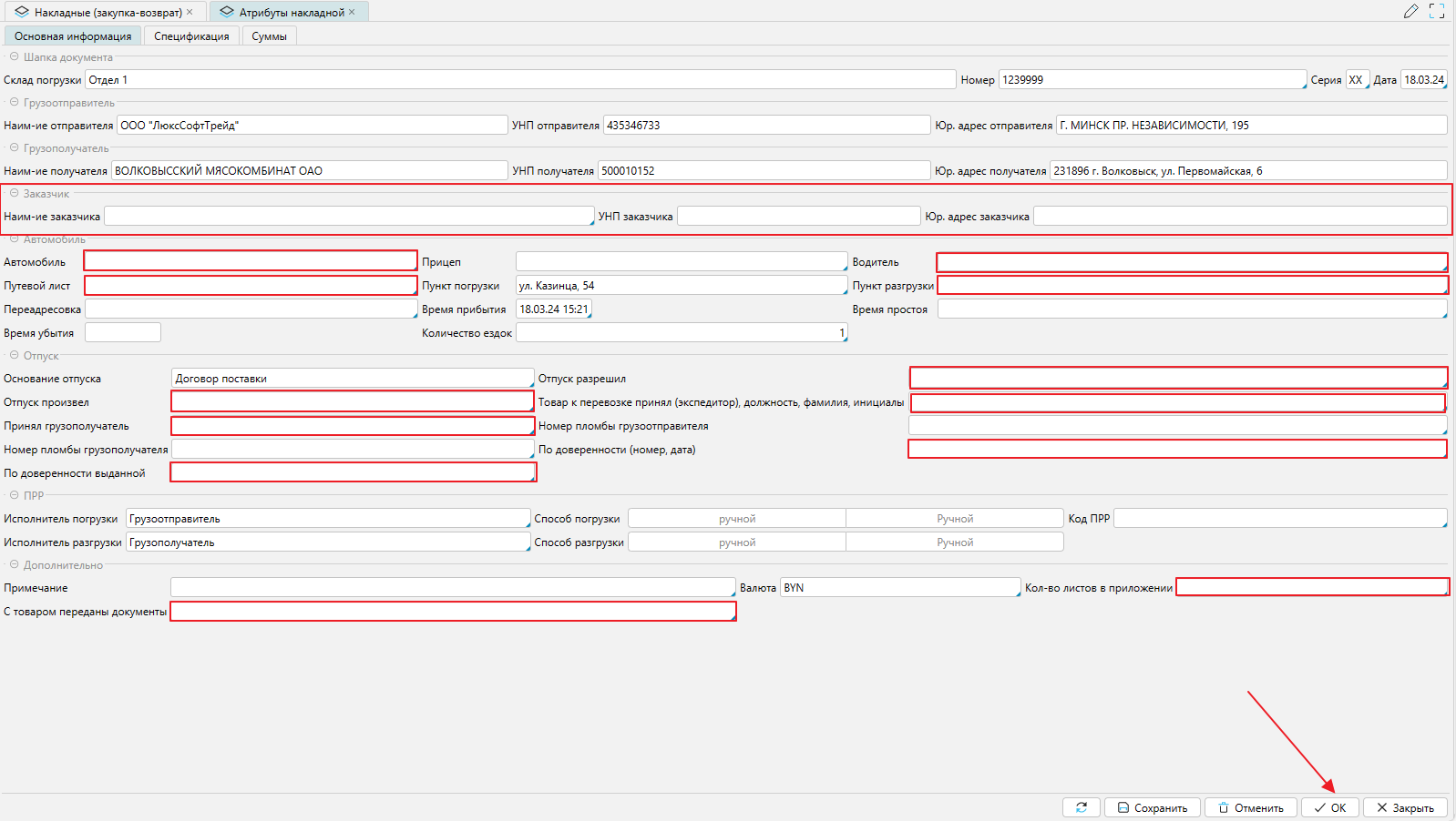 • поле Номер и Серия накладной заполняются в соответствии с номером и серией чистого бланка ТТН.