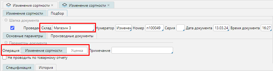 Рис. 3 - Заполненная шапка документа "Изменение сортности".
