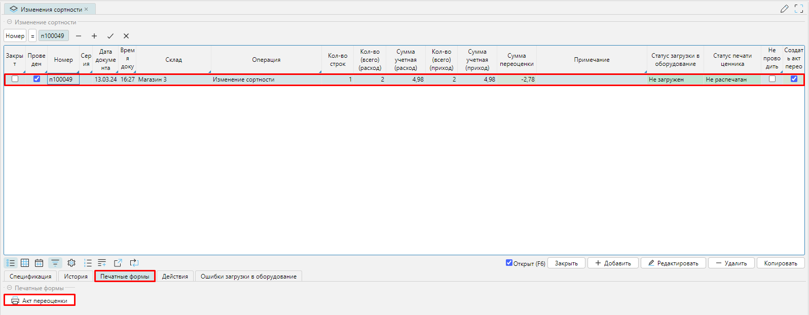Если в системе ведется учет в розничных ценах, то для документа изменения сортности автоматически может быть создана переоценка товаров. На вкладке Производные документы должен быть отмечен признак Создать акт переоценки и выбрана Операция переоценки. Акт переоценки можно распечатать на форме Склад - Изменения сортности вкладка Печатные формы (рис. 6, 7).
