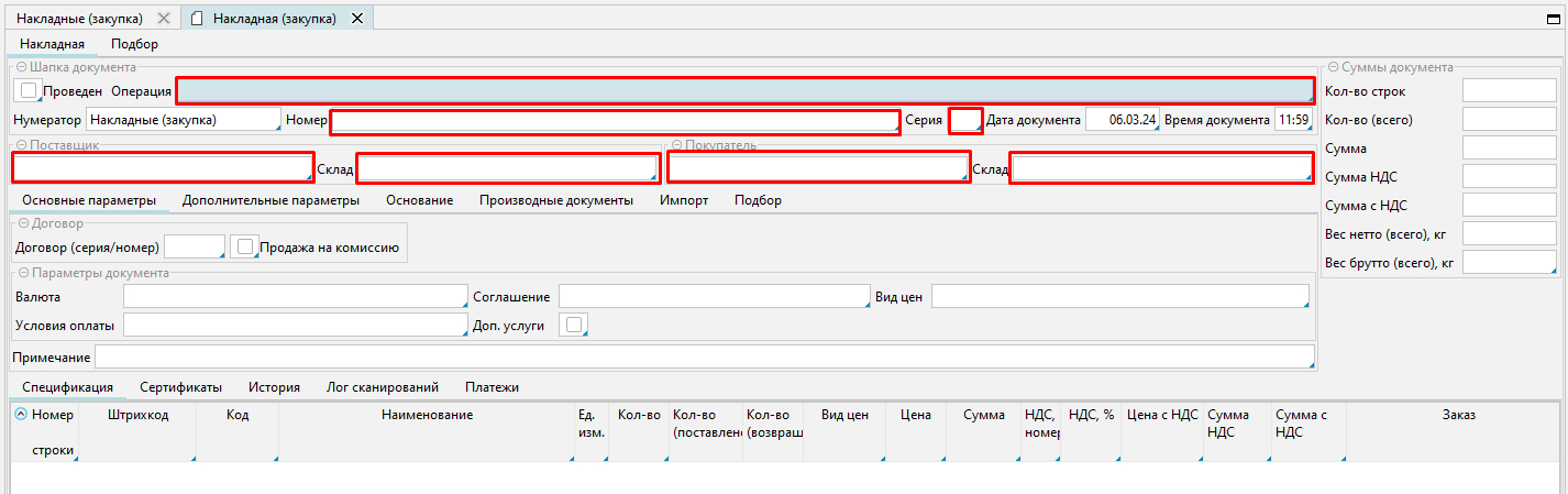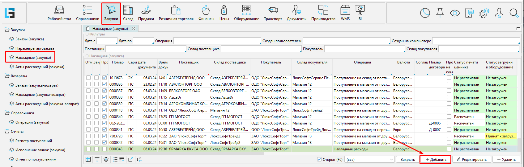 Заходим на форму Накладные модуль Закупки.