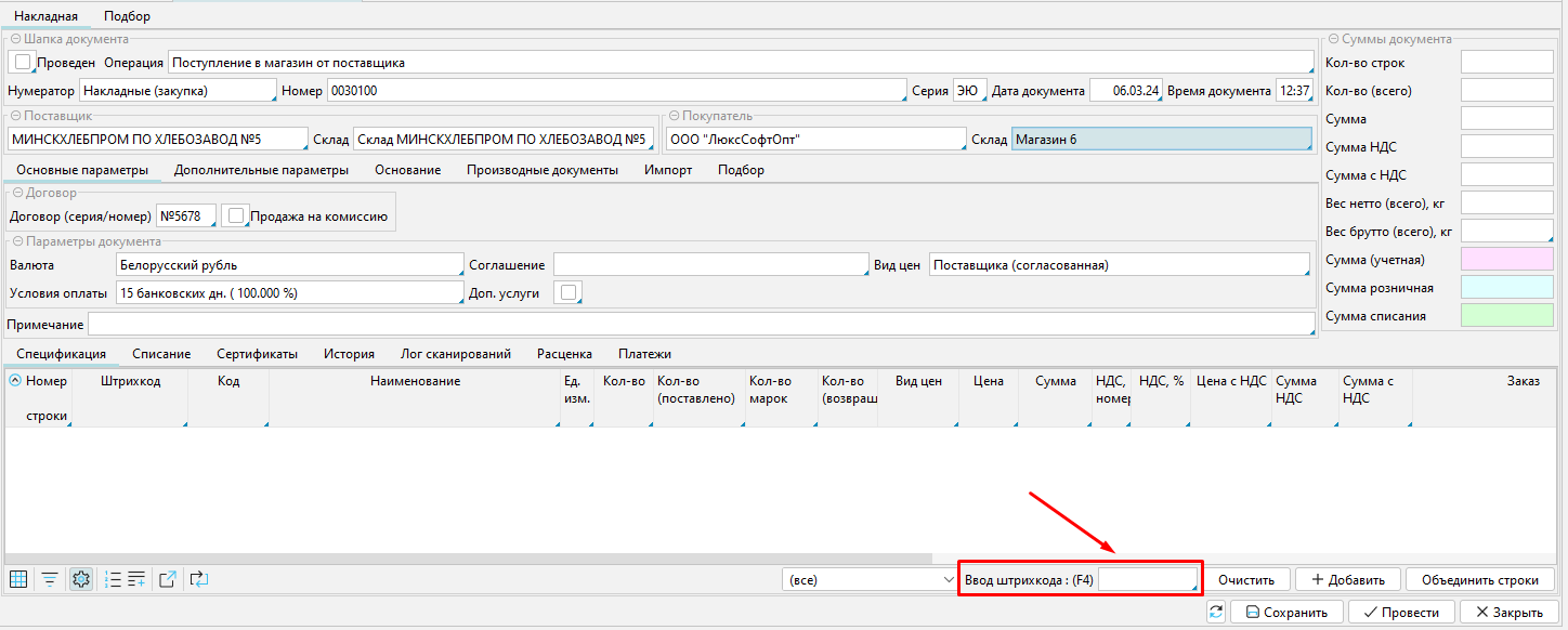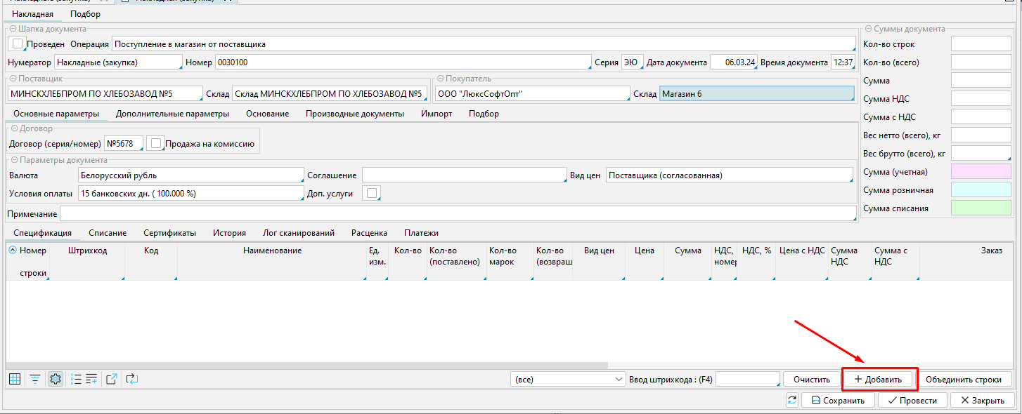 Для заполнения спецификации нам необходимо внести на форму перечень товаров поступающих на магазин.
