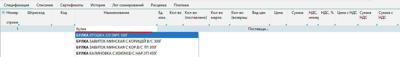 После нажатия кнопка, появится новая строка, для заполнения которой надо в колонке Наименование внести фрагмент названия товара и выбрать необходимый товар.