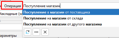 • Поле "Операция" - в этом поле необходимо выбрать вид поступления: 1 - от поставщика, 2 - от склада , 3 - от другого магазина.