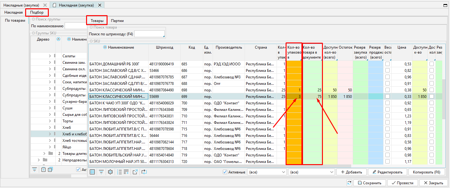 На форме подбора нам необходимо выполнить поиск необходимого товара и внести его количество в колонку "Количество товара в документе" либо "Количество упаковок".