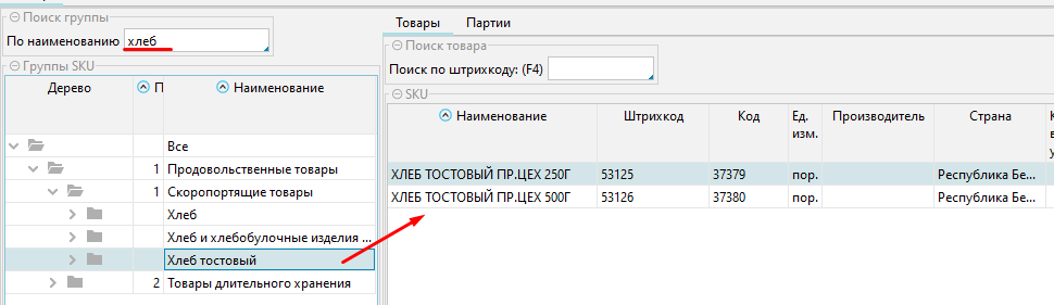 • Поиск по Группе товаров  слева на форме, так же упрощает поиск товаров определенной группы.