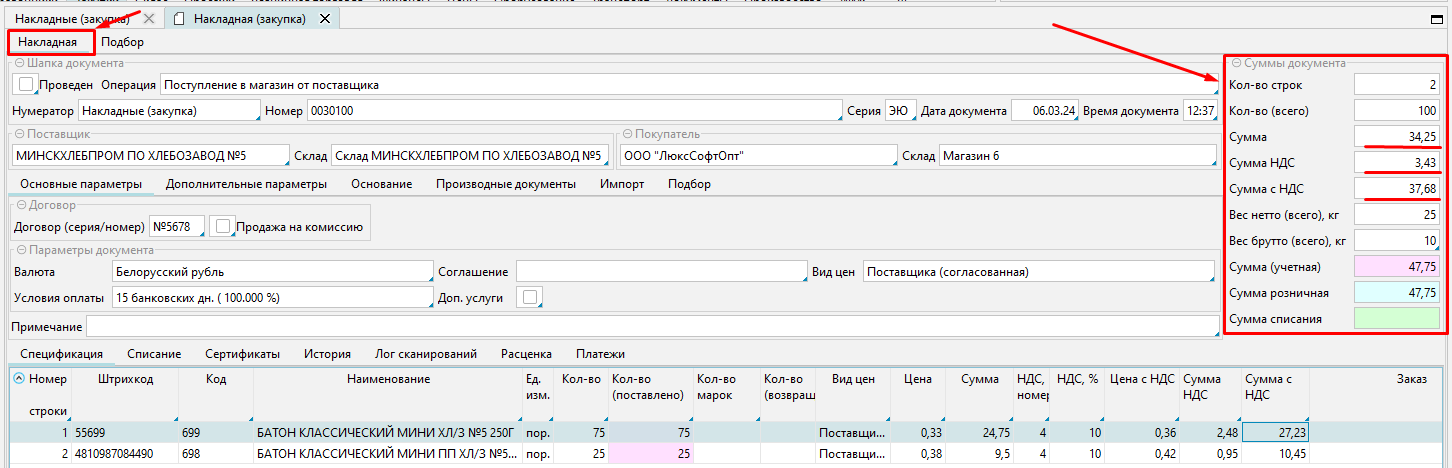 Если мы находились в закладке Подбор, то необходимо вернуться в закладку "Накладная" и сверить суммы в области "Суммы документа" с суммами в ТТН.