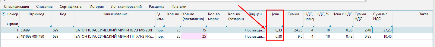 В случае когда цен согласованных с поставщиком в системе нет, тогда нам необходимо в ручную проставить цены по каждой позиции из накладной в колонке "Цена".