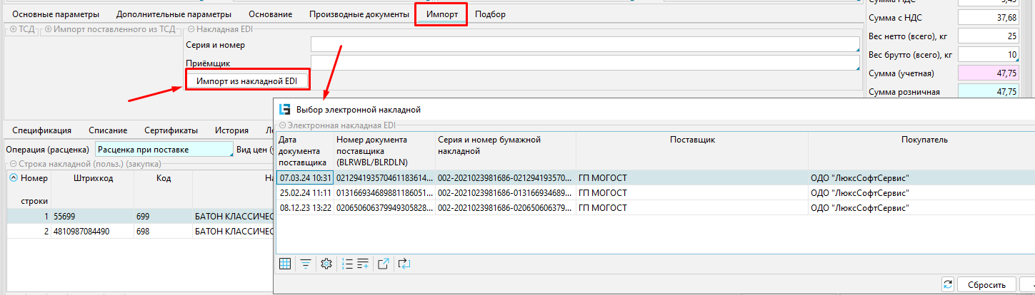 На закладке "Импорт" можно выбрать электронную накладную и нажав кнопку "Импорт из накладной EDI" заполнить спецификацию накладной.