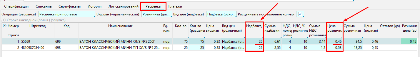 Для формирования розничной цены мы можем изменять надбавку либо вручную внести цену розничную, тогда надбавка рассчитается автоматически.