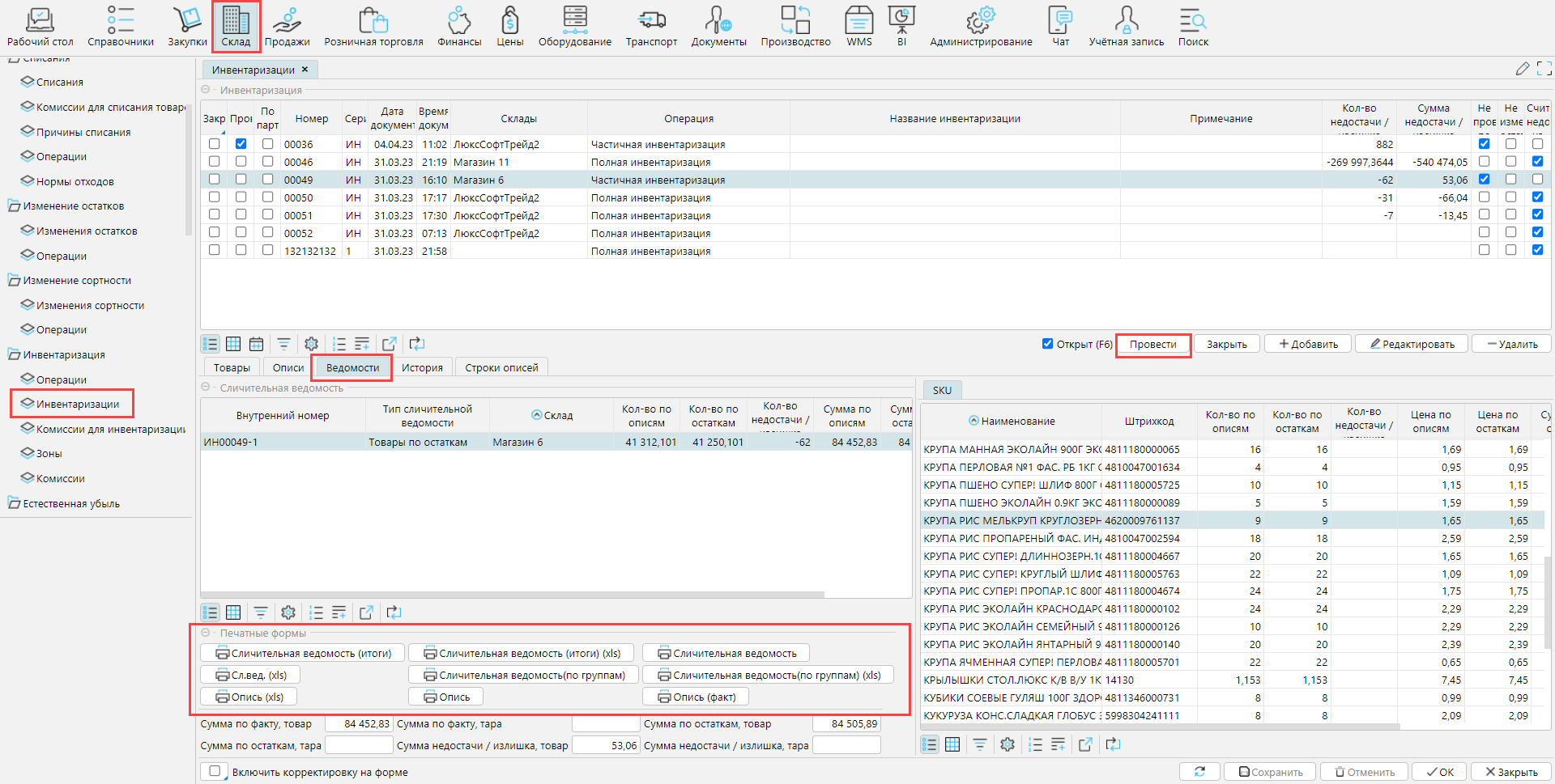 В отличие от большинства документов, кнопка Провести для инвентаризации находится не в документе, а на форме Склад - Инвентаризации.
