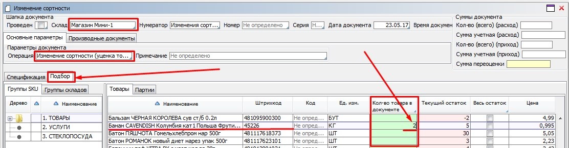 - Выбираем наименование товара, на который будет перевешена та часть остатка товара, подлежащая уценке (Например, Банан (Уцен.))