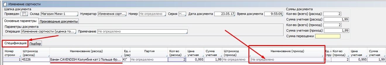 - Далее переходим в Спецификацию. В поле Наименование (приход) кликаем на пустое поле. и выбираем наименование товара, на который будет перевешена та часть остатка товара, подлежащая уценке (Например, Банан (Уцен.))