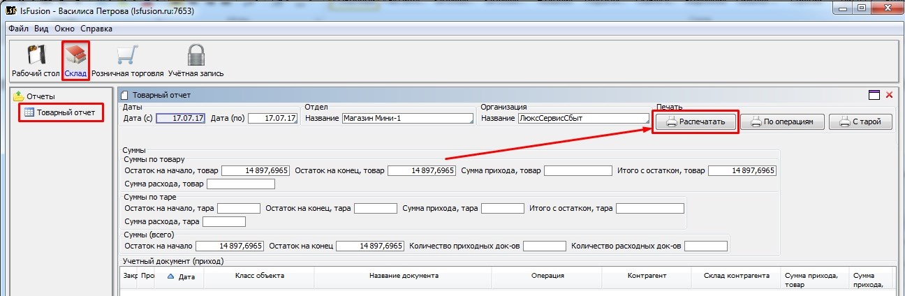 3) Товарный отчет (Модуль Склад ) – отчет по приходу-расходу товаров за период по магазину