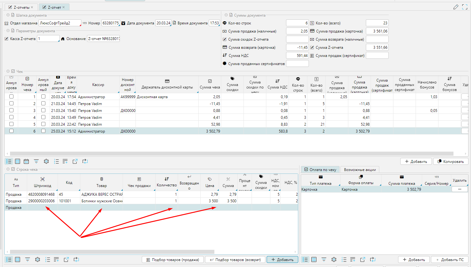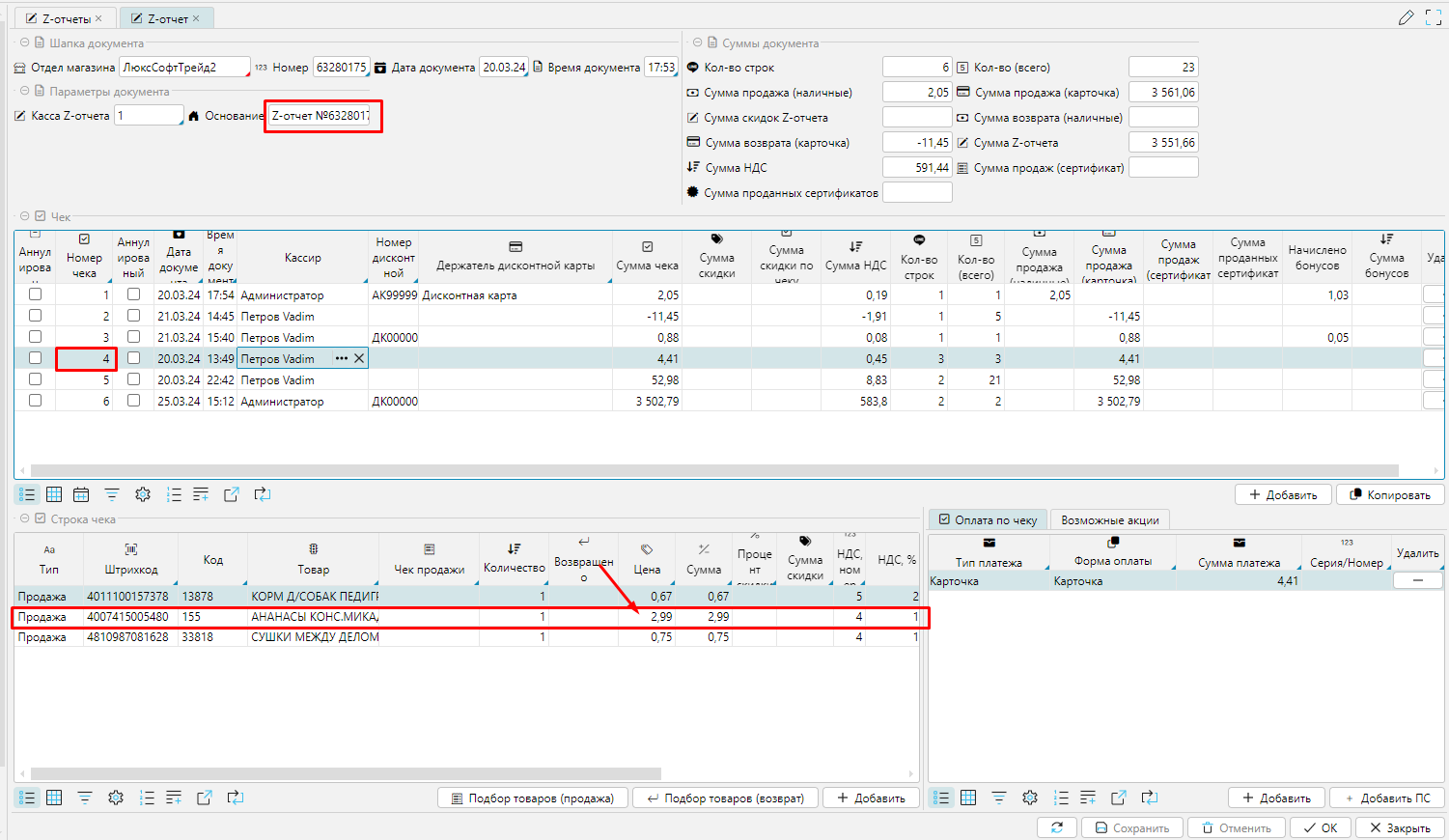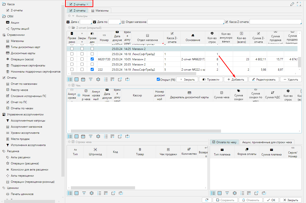В ситуации когда выявлен некорректный чек продажи или формы оплаты есть возможности внести изменения на форме Z-отчеты модуля Розничная торговля: