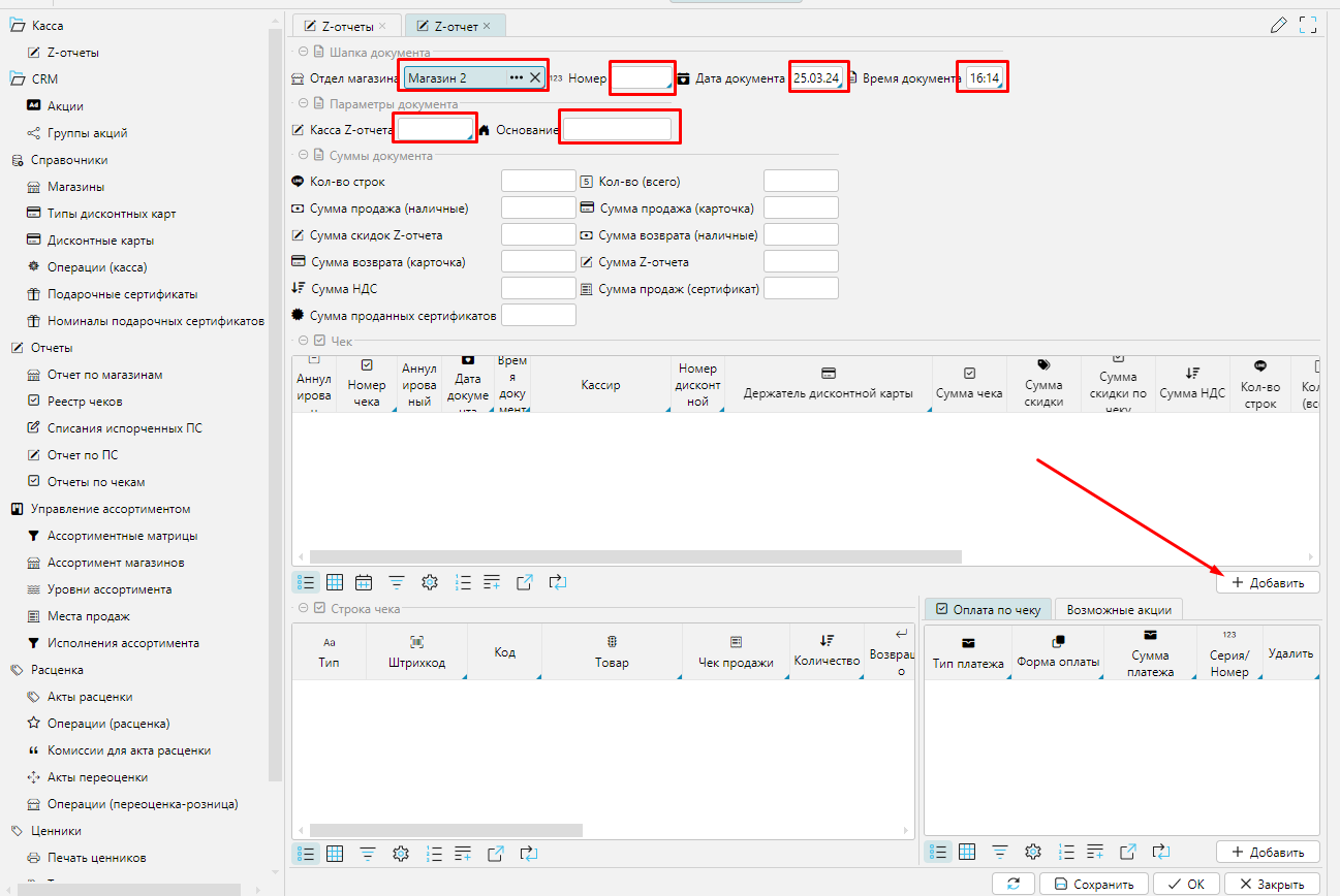 Добавление нового Z-отчета можно осуществить на форме с помощью кнопки "Добавить"