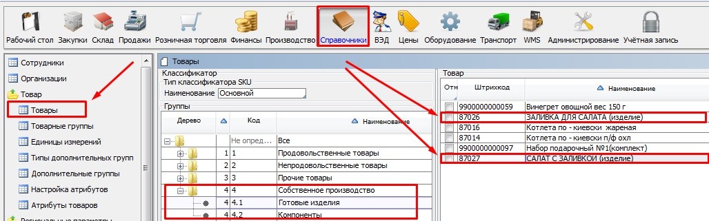 Заходим на форму "Справочники" - "Товары" создаем необходимые карточки товаров и компонент в группе "Собственное Производство":