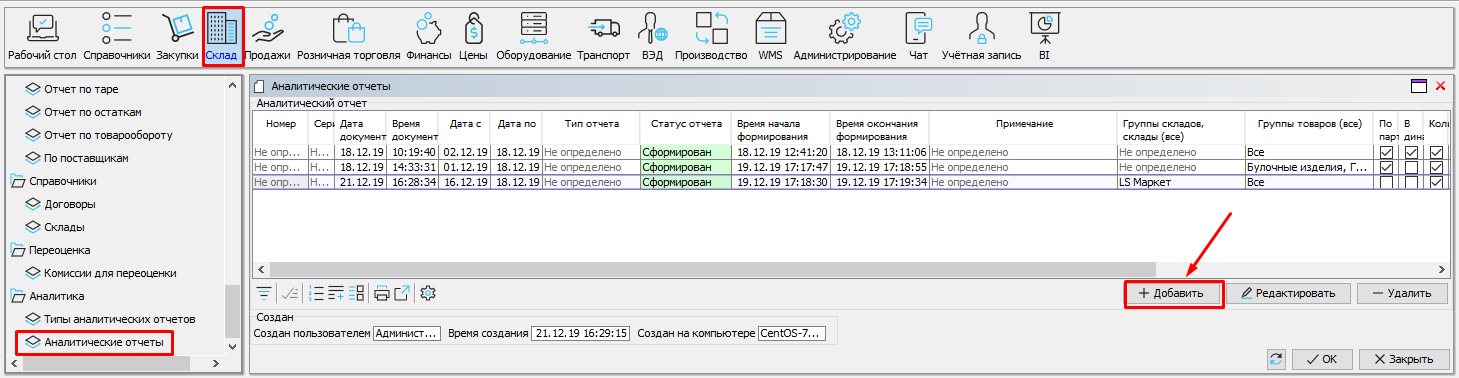 Для создания отчета вручную, на форме Склад\Аналитика\Аналитические отчеты надо нажать кнопку "Добавить".