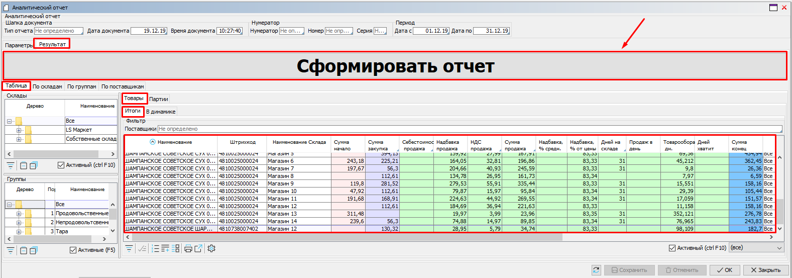 Далее надо перейти на вкладку "Результат" и нажать кнопку "Сформировать отчет". В результате на вкладке "Таблица\Товары\Итоги" будут отображены товары, выбранной группы с показателями, установленными на вкладке "Параметры". При выставленном признаке "В динамике", на вкладке"В динамике" будут отражены те же товары, но по состоянию на каждую дату, входящую в выбранный период. При выставленном признаке "По партиям", на вкладке "Партии" - те же показатели, но для каждой партии товара.